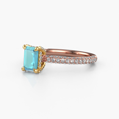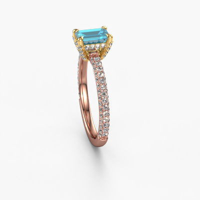 The ring shown above is called the Saskia eme 2. We call this type of ring a pavé solitaire ring because it has one centre gemstone and a band that is also pave set with gemstones. The 14 Carat rose gold engagement ring is set with a emerald cut 6.5x4.5 mm blue topaz centre stone and the band is pave set with diamond gemstones. Each jewel is made by a team of passionate goldsmiths and jewel designers. This will make your crown jewel truly eye-catching.This exclusive rose gold pavé solitaire engagement ring has an exquisite emerald cut blue topaz centre stone. To further accentuate the centre stone, the band is fully set with more diamonds. Its open prong setting allows light to strike the blue topaz from various angles and this adds sparkle to your blue topaz ring. The photo shown above depicts the goldsmith's carefully handcrafted details of the ring. The high positioning of the centre stone is truly eye-catching. The perfect engagement ring for the crown jewel of your life! By using our modern techniques, we can design and customize the finest quality jewels with the utmost care for you. Our engagement rings are always priced 30 percent lower than other jewellers. We make engagement rings to order so we don't have to maintain a large stock. If you have a certain budget, we are more than happy to advice you accordingly.Different styles of new rings are made daily by our team. Perhaps you have found a pavé solitaire engagement ring somewhere. One you would like to give to your loved one. Please feel free to share your thoughts and design with our jewel designers. We would love to turn your design into a exclusive engagement ring. You can follow the development of your ring design because we use very detailed 3D drawings. On top of that, you can order a dummy of the design. A dummy is a plastic ring, which can be shaped according your ring design. You can try it on and check if the engagement ring is up to standard. We will gladly send you a non-binding offer, based on a fair price/ quality ratio. The offer will baffle you, considering the quality of the ring and gemstones.To make it easier for you, we offer a 30 day return policy. Check our terms and conditions.