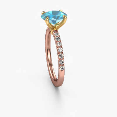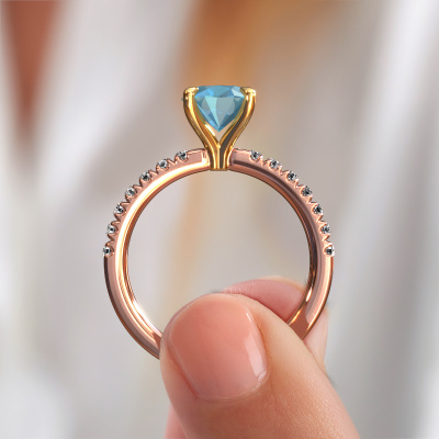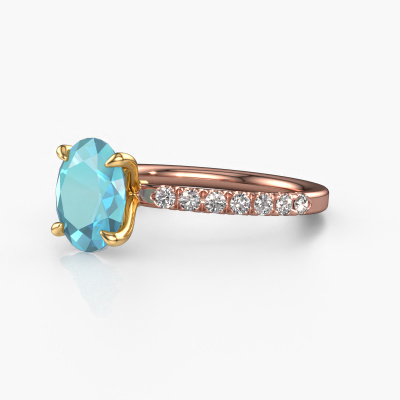 The ring shown above is called the Crystal OVL 2. We call this type of ring a pavé solitaire ring because it has one centre gemstone and a band that is also pave set with gemstones. The 14 Carat rose gold engagement ring is set with a oval 9x7 mm blue topaz centre stone and the band is pave set with lab grown diamond gemstones. Each jewel is made just for you by our master goldsmiths in our own studio.This exclusive rose gold pavé solitaire engagement ring has an exquisite oval blue topaz centre stone. To further accentuate the centre stone, the band is fully set with more lab-grown diamonds. Its open prong setting allows light to strike the blue topaz from various angles and this adds sparkle to your blue topaz ring. The photo shown above depicts the goldsmith's carefully handcrafted details of the ring. The high positioning of the centre stone is truly eye-catching. The perfect engagement ring for the crown jewel of your life! By using a combination of the latest modern techniques, combined with ancient crafting, we can make all our engagement rings in our own studio. Each jewel is made to order. This is advantageous because we can offer you a price you won't find anywhere else.Our team adds new designs to our online collection daily. Our designers and goldsmiths work together in creating the best design. We strive to offer a diverse collection of jewels. Perhaps you have a specific jewel design in mind. One you came across somewhere. Please contact us for a free consultation. We will make you an offer, based on a fair price/ quality ratio, that will baffle you.To make it easier for you, we offer a 30 day return policy. Check our terms and conditions.
