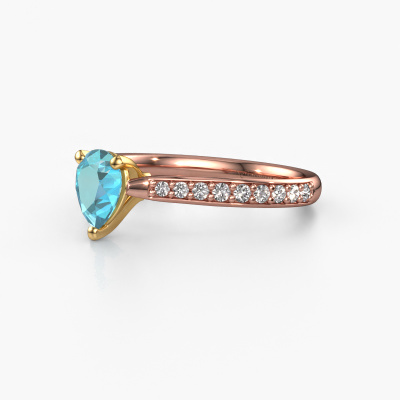 The ring shown above is called the Mignon per 2. We call this type of ring a pavé solitaire ring because it has one centre gemstone and a band that is also pave set with gemstones. The 14 Carat rose gold engagement ring is set with a pear 6.5x4.5 mm blue topaz centre stone and the band is pave set with diamond gemstones. Each jewel is made just for you by our master goldsmiths in our own studio.This trendy rose gold pavé solitaire engagement ring has an exquisite pear blue topaz centre stone. To further accentuate the centre stone, the band is fully set with more diamonds. Its open prong setting allows light to strike the blue topaz from various angles and this adds sparkle to your blue topaz ring. The photo shown above depicts the goldsmith's carefully handcrafted details of the ring. The high positioning of the centre stone is truly eye-catching. The perfect engagement ring for the crown jewel of your life! Are you on a budget? Please feel free to contact us, so we can go discuss your options. We offer our engagement rings at guaranteed best price, because we make them to order. You won't find such a price anywhere else!Our team adds new designs to our online collection daily. Our designers and goldsmiths work together in creating the best design. We strive to offer a diverse collection of jewels. Perhaps you have a specific jewel design in mind. One you came across somewhere. Please contact us for a free consultation. We will make you an offer, based on a fair price/ quality ratio, that will baffle you.To make it easier for you, we offer a 30 day return policy. Check our terms and conditions.