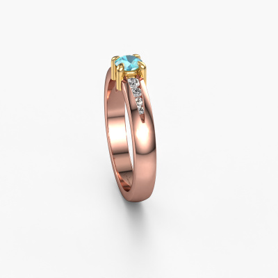 The ring shown above is called the Zohra. We call this type of ring a pavé solitaire ring because it has one centre gemstone and a band that is also pave set with gemstones. The 14 Carat rose gold engagement ring is set with a round 4 mm blue topaz centre stone and the band is pave set with diamond gemstones. Each jewel is made just for you by our master goldsmiths in our own studio.This modern rose gold pavé solitaire engagement ring has an exquisite round blue topaz centre stone. To further accentuate the centre stone, the band is fully set with more diamonds. Its open prong setting allows light to strike the blue topaz from various angles and this adds sparkle to your blue topaz ring. The photo shown above depicts the goldsmith's carefully handcrafted details of the ring. The high positioning of the centre stone is truly eye-catching. The perfect engagement ring for the crown jewel of your life! Because we design and deliver our own rings, we can offer you a engagement ring at a price you won't find anywhere else. A ring is made to order, which helps prevent excess supplies, so we can make you a great price offer. We understand it feels risky, buying your engagement ring online, but we will gladly assist in the designing process, taking your budget into consideration.Our team adds new designs to our online collection daily. Our designers and goldsmiths work together in creating the best design. We strive to offer a diverse collection of jewels. Perhaps you have a specific jewel design in mind. One you came across somewhere. Please contact us for a free consultation. We will make you an offer, based on a fair price/ quality ratio, that will baffle you.To make it easier for you, we offer a 30 day return policy. Check our terms and conditions.
