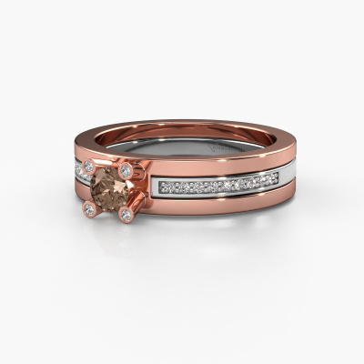 The ring shown above is called the Alisha. We call this type of ring a pavé solitaire ring because it has one centre gemstone and a band that is also pave set with gemstones. The 14 Carat rose gold engagement ring is set with a round 0.25 crt brown diamond centre stone and the band is pave set with diamond gemstones. Each jewel is unique in every way! Simply customize to your liking,This design rose gold pavé solitaire engagement ring has an exquisite round brown diamond centre stone. To further accentuate the centre stone, the band is fully set with more diamonds. Its open prong setting allows light to strike the brown diamond from various angles and this adds sparkle to your brown diamond ring. The photo shown above depicts the goldsmith's carefully handcrafted details of the ring. The high positioning of the centre stone is truly eye-catching. The perfect engagement ring for the crown jewel of your life! By using a combination of the latest modern techniques, combined with ancient crafting, we can make all our engagement rings in our own studio. Each jewel is made to order. This is advantageous because we can offer you a price you won't find anywhere else.Have you found a specific engagement ring somewhere which you would like to give to your loved one? Please feel free to express your wishes to our jewel designers because we would be honoured to turn your design into a design engagement ring. You can follow the development of your ring design because we use 3D drawings. This gives you a realistic preview of how your design will look. You can also preorder a dummy. A dummy is a plastic ring, which can be shaped according your ring design. You can try it on and check if its width and size are suitable for you. We will gladly send you a non-binding offer, based on a fair price/ quality ratio. It will amaze you, considering the quality of the ring and gemstones.To make it easier for you, we offer a 30 day return policy. Check our terms and conditions.