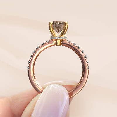The ring shown above is called the Crystal rnd 4. We call this type of ring a pavé solitaire ring because it has one centre gemstone and a band that is also pave set with gemstones. The 14 Carat rose gold engagement ring is set with a round 1.30 crt brown diamond centre stone and the band is pave set with lab grown diamond gemstones. Each jewel is made to shine bright around your finger. Each jewel is hand made with love by our goldsmiths.This fantasy rose gold pavé solitaire engagement ring has an exquisite round brown diamond centre stone. To further accentuate the centre stone, the band is fully set with more lab-grown diamonds. Its open prong setting allows light to strike the brown diamond from various angles and this adds sparkle to your brown diamond ring. The photo shown above depicts the goldsmith's carefully handcrafted details of the ring. The high positioning of the centre stone is truly eye-catching. The perfect engagement ring for the crown jewel of your life! By using our modern techniques, we can design and customize the finest quality jewels with the utmost care for you. Our engagement rings are always priced 30 percent lower than other jewellers. We make engagement rings to order so we don't have to maintain a large stock. If you have a certain budget, we are more than happy to advice you accordingly.Have you found a specific engagement ring somewhere which you would like to give to your loved one? Please feel free to express your wishes to our jewel designers because we would be honoured to turn your design into a fantasy engagement ring. You can follow the development of your ring design because we use 3D drawings. This gives you a realistic preview of how your design will look. You can also preorder a dummy. A dummy is a plastic ring, which can be shaped according your ring design. You can try it on and check if its width and size are suitable for you. We will gladly send you a non-binding offer, based on a fair price/ quality ratio. It will amaze you, considering the quality of the ring and gemstones.To make it easier for you, we offer a 30 day return policy. Check our terms and conditions.
