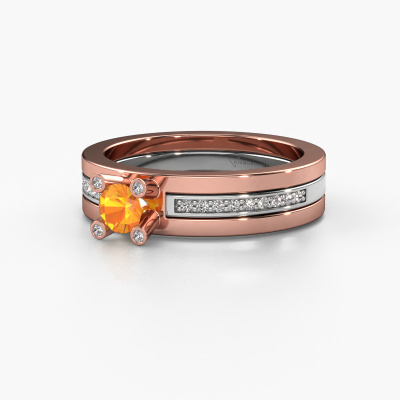 The ring shown above is called the Alisha. We call this type of ring a pavé solitaire ring because it has one centre gemstone and a band that is also pave set with gemstones. The 14 Carat rose gold engagement ring is set with a round 4 mm citrin centre stone and the band is pave set with diamond gemstones. Each jewel is unique in every way! Simply customize to your liking,This design rose gold pavé solitaire engagement ring has an exquisite round citrin centre stone. To further accentuate the centre stone, the band is fully set with more diamonds. Its open prong setting allows light to strike the citrin from various angles and this adds sparkle to your citrin ring. The photo shown above depicts the goldsmith's carefully handcrafted details of the ring. The high positioning of the centre stone is truly eye-catching. The perfect engagement ring for the crown jewel of your life! By using a combination of the latest modern techniques, combined with ancient crafting, we can make all our engagement rings in our own studio. Each jewel is made to order. This is advantageous because we can offer you a price you won't find anywhere else.Have you found a specific engagement ring somewhere which you would like to give to your loved one? Please feel free to express your wishes to our jewel designers because we would be honoured to turn your design into a design engagement ring. You can follow the development of your ring design because we use 3D drawings. This gives you a realistic preview of how your design will look. You can also preorder a dummy. A dummy is a plastic ring, which can be shaped according your ring design. You can try it on and check if its width and size are suitable for you. We will gladly send you a non-binding offer, based on a fair price/ quality ratio. It will amaze you, considering the quality of the ring and gemstones.To make it easier for you, we offer a 30 day return policy. Check our terms and conditions.