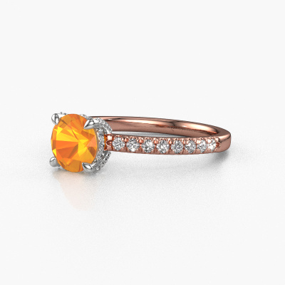 The ring shown above is called the Saskia rnd 1. We call this type of ring a pavé solitaire ring because it has one centre gemstone and a band that is also pave set with gemstones. The 14 Carat rose gold engagement ring is set with a round 6.5 mm citrin centre stone and the band is pave set with lab grown diamond gemstones. Each jewel is made with passion and love by one of our master goldsmiths.This exclusive rose gold pavé solitaire engagement ring has an exquisite round citrin centre stone. To further accentuate the centre stone, the band is fully set with more lab-grown diamonds. Its open prong setting allows light to strike the citrin from various angles and this adds sparkle to your citrin ring. The photo shown above depicts the goldsmith's carefully handcrafted details of the ring. The high positioning of the centre stone is truly eye-catching. The perfect engagement ring for the crown jewel of your life! By using a combination of the latest modern techniques, combined with ancient crafting, we can make all our engagement rings in our own studio. Each jewel is made to order. This is advantageous because we can offer you a price you won't find anywhere else.Do you have a specific ring in mind? One you came across somewhere. Please feel free to tell us your wishes and we will turn your design into a unique engagement ring. You can follow the development of your ring design because we use 3D drawings. This gives you a realistic preview of your design. We will gladly send you a non-binding offer, based on a fair price/ quality ratio. It will amaze you.To make it easier for you, we offer a 30 day return policy. Check our terms and conditions.