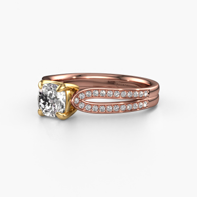 The ring shown above is called the Antonia cus 2. We call this type of ring a pavé solitaire ring because it has one centre gemstone and a band that is also pave set with gemstones. The 14 Carat rose gold engagement ring is set with a cushion 1.00 crt diamond centre stone and the band is pave set with lab grown diamond gemstones. Each jewel is made just for you by our master goldsmiths in our own studio.This fantasy rose gold pavé solitaire engagement ring has an exquisite cushion diamond centre stone. To further accentuate the centre stone, the band is fully set with more lab-grown diamonds. Its open prong setting allows light to strike the diamond from various angles and this adds sparkle to your diamond ring. The photo shown above depicts the goldsmith's carefully handcrafted details of the ring. The high positioning of the centre stone is truly eye-catching. The perfect engagement ring for the crown jewel of your life! By using our modern techniques, we can design and customize the finest quality jewels with the utmost care for you. Our engagement rings are always priced 30 percent lower than other jewellers. We make engagement rings to order so we don't have to maintain a large stock. If you have a certain budget, we are more than happy to advice you accordingly.Have you found a specific engagement ring somewhere which you would like to give to your loved one? Please feel free to express your wishes to our jewel designers because we would be honoured to turn your design into a fantasy engagement ring. You can follow the development of your ring design because we use 3D drawings. This gives you a realistic preview of how your design will look. You can also preorder a dummy. A dummy is a plastic ring, which can be shaped according your ring design. You can try it on and check if its width and size are suitable for you. We will gladly send you a non-binding offer, based on a fair price/ quality ratio. It will amaze you, considering the quality of the ring and gemstones.To make it easier for you, we offer a 30 day return policy. Check our terms and conditions.