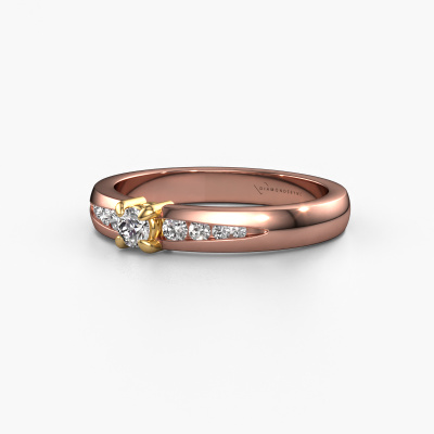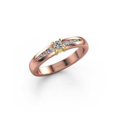 The ring shown above is called the Zohra. We call this type of ring a pavé solitaire ring because it has one centre gemstone and a band that is also pave set with gemstones. The 14 Carat rose gold engagement ring is set with a round 0.10 crt diamond centre stone and the band is pave set with diamond gemstones. Each jewel is made just for you by our master goldsmiths in our own studio.This modern rose gold pavé solitaire engagement ring has an exquisite round diamond centre stone. To further accentuate the centre stone, the band is fully set with more diamonds. Its open prong setting allows light to strike the diamond from various angles and this adds sparkle to your diamond ring. The photo shown above depicts the goldsmith's carefully handcrafted details of the ring. The high positioning of the centre stone is truly eye-catching. The perfect engagement ring for the crown jewel of your life! Because we design and deliver our own rings, we can offer you a engagement ring at a price you won't find anywhere else. A ring is made to order, which helps prevent excess supplies, so we can make you a great price offer. We understand it feels risky, buying your engagement ring online, but we will gladly assist in the designing process, taking your budget into consideration.Our team adds new designs to our online collection daily. Our designers and goldsmiths work together in creating the best design. We strive to offer a diverse collection of jewels. Perhaps you have a specific jewel design in mind. One you came across somewhere. Please contact us for a free consultation. We will make you an offer, based on a fair price/ quality ratio, that will baffle you.To make it easier for you, we offer a 30 day return policy. Check our terms and conditions.