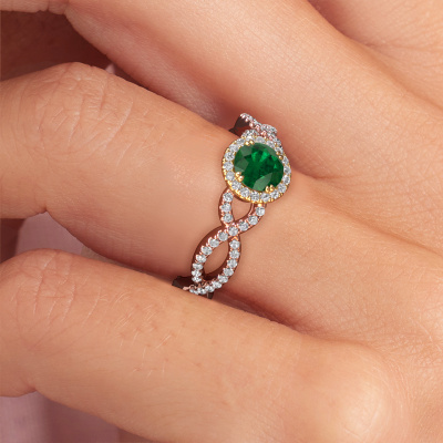 The ring shown above is called the Dionne rnd. We call this type of ring a pavé solitaire ring because it has one centre gemstone and a band that is also pave set with gemstones. The 14 Carat rose gold engagement ring is set with a round 5 mm emerald centre stone and the band is pave set with diamond gemstones. Each jewel is made just for you by our master goldsmiths in our own studio.This classic rose gold pavé solitaire engagement ring has an exquisite round emerald centre stone. To further accentuate the centre stone, the band is fully set with more diamonds. Its open prong setting allows light to strike the emerald from various angles and this adds sparkle to your emerald ring. The photo shown above depicts the goldsmith's carefully handcrafted details of the ring. The high positioning of the centre stone is truly eye-catching. The perfect engagement ring for the crown jewel of your life! Because we design and deliver our own rings, we can offer you a engagement ring at a price you won't find anywhere else. A ring is made to order, which helps prevent excess supplies, so we can make you a great price offer. We understand it feels risky, buying your engagement ring online, but we will gladly assist in the designing process, taking your budget into consideration.Do you have a specific ring in mind? One you came across somewhere. Please feel free to tell us your wishes and we will turn your design into a unique engagement ring. You can follow the development of your ring design because we use 3D drawings. This gives you a realistic preview of your design. We will gladly send you a non-binding offer, based on a fair price/ quality ratio. It will amaze you.To make it easier for you, we offer a 30 day return policy. Check our terms and conditions.