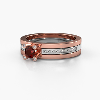 The ring shown above is called the Alisha. We call this type of ring a pavé solitaire ring because it has one centre gemstone and a band that is also pave set with gemstones. The 14 Carat rose gold engagement ring is set with a round 4 mm garnet centre stone and the band is pave set with diamond gemstones. Each jewel is unique in every way! Simply customize to your liking,This design rose gold pavé solitaire engagement ring has an exquisite round garnet centre stone. To further accentuate the centre stone, the band is fully set with more diamonds. Its open prong setting allows light to strike the garnet from various angles and this adds sparkle to your garnet ring. The photo shown above depicts the goldsmith's carefully handcrafted details of the ring. The high positioning of the centre stone is truly eye-catching. The perfect engagement ring for the crown jewel of your life! By using a combination of the latest modern techniques, combined with ancient crafting, we can make all our engagement rings in our own studio. Each jewel is made to order. This is advantageous because we can offer you a price you won't find anywhere else.Have you found a specific engagement ring somewhere which you would like to give to your loved one? Please feel free to express your wishes to our jewel designers because we would be honoured to turn your design into a design engagement ring. You can follow the development of your ring design because we use 3D drawings. This gives you a realistic preview of how your design will look. You can also preorder a dummy. A dummy is a plastic ring, which can be shaped according your ring design. You can try it on and check if its width and size are suitable for you. We will gladly send you a non-binding offer, based on a fair price/ quality ratio. It will amaze you, considering the quality of the ring and gemstones.To make it easier for you, we offer a 30 day return policy. Check our terms and conditions.