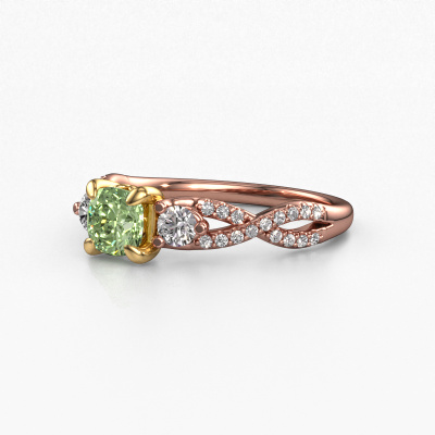 The ring shown above is called the Marilou CUS. We call this type of ring a 3-stone ring because it has one centre gemstone and a band that is also pave set with gemstones. The 14 Carat rose gold engagement ring is set with a cushion 5 mm green lab grown diamond centre stone and the band is pave set with diamond gemstones. Each jewel is unique in every way! Simply customize to your liking,This traditional rose gold 3-stone engagement ring has an exquisite cushion green lab grown diamond centre stone. To further accentuate the centre stone, the band is fully set with more diamonds. Its open prong setting allows light to strike the green lab grown diamond from various angles and this adds sparkle to your green lab grown diamond ring. The photo shown above depicts the goldsmith's carefully handcrafted details of the ring. The high positioning of the centre stone is truly eye-catching. The perfect engagement ring for the crown jewel of your life! By using a combination of the latest modern techniques, combined with ancient crafting, we can make all our engagement rings in our own studio. Each jewel is made to order. This is advantageous because we can offer you a price you won't find anywhere else.Our team adds new designs to our online collection daily. Our designers and goldsmiths work together in creating the best design. We strive to offer a diverse collection of jewels. Perhaps you have a specific jewel design in mind. One you came across somewhere. Please contact us for a free consultation. We will make you an offer, based on a fair price/ quality ratio, that will baffle you.To make it easier for you, we offer a 30 day return policy. Check our terms and conditions.