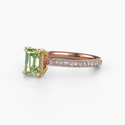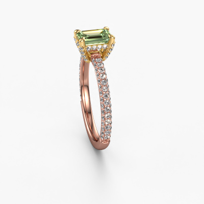 The ring shown above is called the Saskia eme 2. We call this type of ring a pavé solitaire ring because it has one centre gemstone and a band that is also pave set with gemstones. The 14 Carat rose gold engagement ring is set with a emerald cut 6.5x4.5 mm green lab grown diamond centre stone and the band is pave set with diamond gemstones. Each jewel is made by a team of passionate goldsmiths and jewel designers. This will make your crown jewel truly eye-catching.This exclusive rose gold pavé solitaire engagement ring has an exquisite emerald cut green lab grown diamond centre stone. To further accentuate the centre stone, the band is fully set with more diamonds. Its open prong setting allows light to strike the green lab grown diamond from various angles and this adds sparkle to your green lab grown diamond ring. The photo shown above depicts the goldsmith's carefully handcrafted details of the ring. The high positioning of the centre stone is truly eye-catching. The perfect engagement ring for the crown jewel of your life! By using our modern techniques, we can design and customize the finest quality jewels with the utmost care for you. Our engagement rings are always priced 30 percent lower than other jewellers. We make engagement rings to order so we don't have to maintain a large stock. If you have a certain budget, we are more than happy to advice you accordingly.Different styles of new rings are made daily by our team. Perhaps you have found a pavé solitaire engagement ring somewhere. One you would like to give to your loved one. Please feel free to share your thoughts and design with our jewel designers. We would love to turn your design into a exclusive engagement ring. You can follow the development of your ring design because we use very detailed 3D drawings. On top of that, you can order a dummy of the design. A dummy is a plastic ring, which can be shaped according your ring design. You can try it on and check if the engagement ring is up to standard. We will gladly send you a non-binding offer, based on a fair price/ quality ratio. The offer will baffle you, considering the quality of the ring and gemstones.To make it easier for you, we offer a 30 day return policy. Check our terms and conditions.
