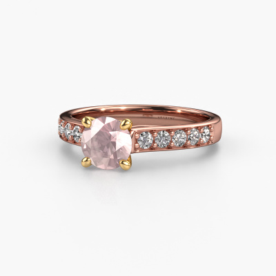 The ring shown above is called the Valorie RND 2. We call this type of ring a pavé solitaire ring because it has one centre gemstone and a band that is also pave set with gemstones. The 14 Carat rose gold engagement ring is set with a round 6.5 mm morganite champagne centre stone and the band is pave set with lab grown diamond gemstones. Each jewel is made just for you, with attention to detail and design.This modern rose gold pavé solitaire engagement ring has an exquisite round morganite champagne centre stone. To further accentuate the centre stone, the band is fully set with more lab-grown diamonds. Its open prong setting allows light to strike the morganite champagne from various angles and this adds sparkle to your morganite champagne ring. The photo shown above depicts the goldsmith's carefully handcrafted details of the ring. The high positioning of the centre stone is truly eye-catching. The perfect engagement ring for the crown jewel of your life! By using our modern techniques, we can design and customize the finest quality jewels with the utmost care for you. Our engagement rings are always priced 30 percent lower than other jewellers. We make engagement rings to order so we don't have to maintain a large stock. If you have a certain budget, we are more than happy to advice you accordingly.Our designers and goldsmiths work together each day, creating new jewels. Perhaps you have found a nice modern engagement ring somewhere, which can be used to customize your unique ring. Please feel free to contact us. We will make you an offer, based on a fair price/ quality ratio, which will amaze you.To make it easier for you, we offer a 30 day return policy. Check our terms and conditions.