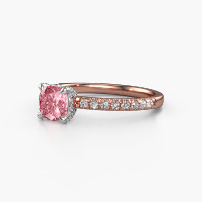 The ring shown above is called the Saskia 1 cus. We call this type of ring a pavé solitaire ring because it has one centre gemstone and a band that is also pave set with gemstones. The 14 Carat rose gold engagement ring is set with a cushion 5.5 mm pink lab grown diamond centre stone and the band is pave set with diamond gemstones. Each jewel is made by a team of passionate goldsmiths and jewel designers. This will make your crown jewel truly eye-catching.This unique rose gold pavé solitaire engagement ring has an exquisite cushion pink lab grown diamond centre stone. To further accentuate the centre stone, the band is fully set with more diamonds. Its open prong setting allows light to strike the pink lab grown diamond from various angles and this adds sparkle to your pink lab grown diamond ring. The photo shown above depicts the goldsmith's carefully handcrafted details of the ring. The high positioning of the centre stone is truly eye-catching. The perfect engagement ring for the crown jewel of your life! By using a combination of the latest modern techniques, combined with ancient crafting, we can make all our engagement rings in our own studio. Each jewel is made to order. This is advantageous because we can offer you a price you won't find anywhere else.Our team adds new designs to our online collection daily. Our designers and goldsmiths work together in creating the best design. We strive to offer a diverse collection of jewels. Perhaps you have a specific jewel design in mind. One you came across somewhere. Please contact us for a free consultation. We will make you an offer, based on a fair price/ quality ratio, that will baffle you.To make it easier for you, we offer a 30 day return policy. Check our terms and conditions.