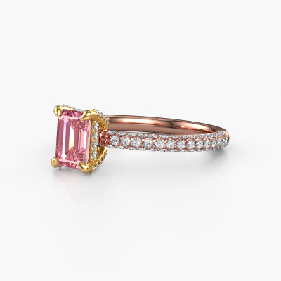 The ring shown above is called the Saskia EME 2. We call this type of ring a pavé solitaire ring because it has one centre gemstone and a band that is also pave set with gemstones. The 14 Carat rose gold engagement ring is set with a emerald cut 6.5x4.5 mm pink lab grown diamond centre stone and the band is pave set with diamond gemstones. Each jewel is made by a team of passionate goldsmiths and jewel designers. This will make your crown jewel truly eye-catching.This exclusive rose gold pavé solitaire engagement ring has an exquisite emerald cut pink lab grown diamond centre stone. To further accentuate the centre stone, the band is fully set with more diamonds. Its open prong setting allows light to strike the pink lab grown diamond from various angles and this adds sparkle to your pink lab grown diamond ring. The photo shown above depicts the goldsmith's carefully handcrafted details of the ring. The high positioning of the centre stone is truly eye-catching. The perfect engagement ring for the crown jewel of your life! By using our modern techniques, we can design and customize the finest quality jewels with the utmost care for you. Our engagement rings are always priced 30 percent lower than other jewellers. We make engagement rings to order so we don't have to maintain a large stock. If you have a certain budget, we are more than happy to advice you accordingly.Different styles of new rings are made daily by our team. Perhaps you have found a pavé solitaire engagement ring somewhere. One you would like to give to your loved one. Please feel free to share your thoughts and design with our jewel designers. We would love to turn your design into a exclusive engagement ring. You can follow the development of your ring design because we use very detailed 3D drawings. On top of that, you can order a dummy of the design. A dummy is a plastic ring, which can be shaped according your ring design. You can try it on and check if the engagement ring is up to standard. We will gladly send you a non-binding offer, based on a fair price/ quality ratio. The offer will baffle you, considering the quality of the ring and gemstones.To make it easier for you, we offer a 30 day return policy. Check our terms and conditions.