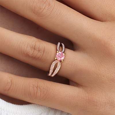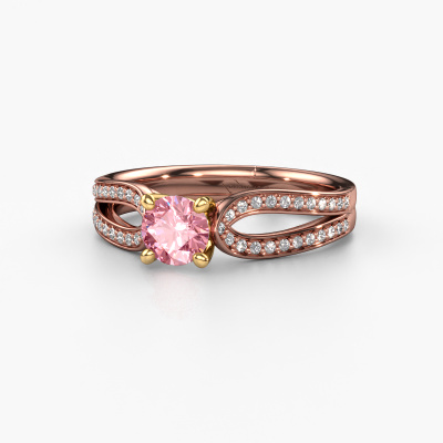 The ring shown above is called the Antonia rnd 2. We call this type of ring a pavé solitaire ring because it has one centre gemstone and a band that is also pave set with gemstones. The 14 Carat rose gold engagement ring is set with a round 5 mm pink lab grown diamond centre stone and the band is pave set with diamond gemstones. Each jewel is made just for you, with attention to detail and design.This traditional rose gold pavé solitaire engagement ring has an exquisite round pink lab grown diamond centre stone. To further accentuate the centre stone, the band is fully set with more diamonds. Its open prong setting allows light to strike the pink lab grown diamond from various angles and this adds sparkle to your pink lab grown diamond ring. The photo shown above depicts the goldsmith's carefully handcrafted details of the ring. The high positioning of the centre stone is truly eye-catching. The perfect engagement ring for the crown jewel of your life! After receiving your order, our goldsmiths will start the creative process of making your Antonia rnd 2 engagement ring. We don't keep stock. This is advantageous because these costs will not be passed on to you. Therefore, we can offer jewellery at exceptionally low prices.Have you found a specific engagement ring somewhere which you would like to give to your loved one? Please feel free to express your wishes to our jewel designers because we would be honoured to turn your design into a traditional engagement ring. You can follow the development of your ring design because we use 3D drawings. This gives you a realistic preview of how your design will look. You can also preorder a dummy. A dummy is a plastic ring, which can be shaped according your ring design. You can try it on and check if its width and size are suitable for you. We will gladly send you a non-binding offer, based on a fair price/ quality ratio. It will amaze you, considering the quality of the ring and gemstones.To make it easier for you, we offer a 30 day return policy. Check our terms and conditions.