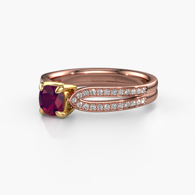 The ring shown above is called the Antonia cus 2. We call this type of ring a pavé solitaire ring because it has one centre gemstone and a band that is also pave set with gemstones. The 14 Carat rose gold engagement ring is set with a cushion 5 mm rhodolite centre stone and the band is pave set with lab grown diamond gemstones. Each jewel is made just for you by our master goldsmiths in our own studio.This fantasy rose gold pavé solitaire engagement ring has an exquisite cushion rhodolite centre stone. To further accentuate the centre stone, the band is fully set with more lab-grown diamonds. Its open prong setting allows light to strike the rhodolite from various angles and this adds sparkle to your rhodolite ring. The photo shown above depicts the goldsmith's carefully handcrafted details of the ring. The high positioning of the centre stone is truly eye-catching. The perfect engagement ring for the crown jewel of your life! By using our modern techniques, we can design and customize the finest quality jewels with the utmost care for you. Our engagement rings are always priced 30 percent lower than other jewellers. We make engagement rings to order so we don't have to maintain a large stock. If you have a certain budget, we are more than happy to advice you accordingly.Have you found a specific engagement ring somewhere which you would like to give to your loved one? Please feel free to express your wishes to our jewel designers because we would be honoured to turn your design into a fantasy engagement ring. You can follow the development of your ring design because we use 3D drawings. This gives you a realistic preview of how your design will look. You can also preorder a dummy. A dummy is a plastic ring, which can be shaped according your ring design. You can try it on and check if its width and size are suitable for you. We will gladly send you a non-binding offer, based on a fair price/ quality ratio. It will amaze you, considering the quality of the ring and gemstones.To make it easier for you, we offer a 30 day return policy. Check our terms and conditions.
