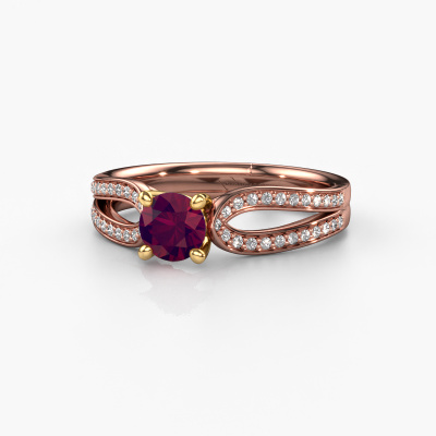 The ring shown above is called the Antonia rnd 2. We call this type of ring a pavé solitaire ring because it has one centre gemstone and a band that is also pave set with gemstones. The 14 Carat rose gold engagement ring is set with a round 5 mm rhodolite centre stone and the band is pave set with diamond gemstones. Each jewel is made just for you, with attention to detail and design.This traditional rose gold pavé solitaire engagement ring has an exquisite round rhodolite centre stone. To further accentuate the centre stone, the band is fully set with more diamonds. Its open prong setting allows light to strike the rhodolite from various angles and this adds sparkle to your rhodolite ring. The photo shown above depicts the goldsmith's carefully handcrafted details of the ring. The high positioning of the centre stone is truly eye-catching. The perfect engagement ring for the crown jewel of your life! After receiving your order, our goldsmiths will start the creative process of making your Antonia rnd 2 engagement ring. We don't keep stock. This is advantageous because these costs will not be passed on to you. Therefore, we can offer jewellery at exceptionally low prices.Have you found a specific engagement ring somewhere which you would like to give to your loved one? Please feel free to express your wishes to our jewel designers because we would be honoured to turn your design into a traditional engagement ring. You can follow the development of your ring design because we use 3D drawings. This gives you a realistic preview of how your design will look. You can also preorder a dummy. A dummy is a plastic ring, which can be shaped according your ring design. You can try it on and check if its width and size are suitable for you. We will gladly send you a non-binding offer, based on a fair price/ quality ratio. It will amaze you, considering the quality of the ring and gemstones.To make it easier for you, we offer a 30 day return policy. Check our terms and conditions.