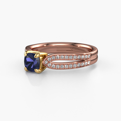 The ring shown above is called the Antonia cus 2. We call this type of ring a pavé solitaire ring because it has one centre gemstone and a band that is also pave set with gemstones. The 14 Carat rose gold engagement ring is set with a cushion 5 mm sapphire centre stone and the band is pave set with lab grown diamond gemstones. Each jewel is made just for you by our master goldsmiths in our own studio.This fantasy rose gold pavé solitaire engagement ring has an exquisite cushion sapphire centre stone. To further accentuate the centre stone, the band is fully set with more lab-grown diamonds. Its open prong setting allows light to strike the sapphire from various angles and this adds sparkle to your sapphire ring. The photo shown above depicts the goldsmith's carefully handcrafted details of the ring. The high positioning of the centre stone is truly eye-catching. The perfect engagement ring for the crown jewel of your life! By using our modern techniques, we can design and customize the finest quality jewels with the utmost care for you. Our engagement rings are always priced 30 percent lower than other jewellers. We make engagement rings to order so we don't have to maintain a large stock. If you have a certain budget, we are more than happy to advice you accordingly.Have you found a specific engagement ring somewhere which you would like to give to your loved one? Please feel free to express your wishes to our jewel designers because we would be honoured to turn your design into a fantasy engagement ring. You can follow the development of your ring design because we use 3D drawings. This gives you a realistic preview of how your design will look. You can also preorder a dummy. A dummy is a plastic ring, which can be shaped according your ring design. You can try it on and check if its width and size are suitable for you. We will gladly send you a non-binding offer, based on a fair price/ quality ratio. It will amaze you, considering the quality of the ring and gemstones.To make it easier for you, we offer a 30 day return policy. Check our terms and conditions.