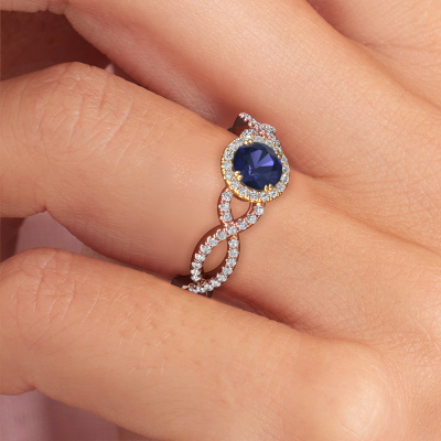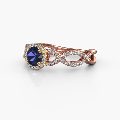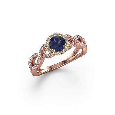 The ring shown above is called the Dionne rnd. We call this type of ring a pavé solitaire ring because it has one centre gemstone and a band that is also pave set with gemstones. The 14 Carat rose gold engagement ring is set with a round 5 mm sapphire centre stone and the band is pave set with diamond gemstones. Each jewel is made just for you by our master goldsmiths in our own studio.This classic rose gold pavé solitaire engagement ring has an exquisite round sapphire centre stone. To further accentuate the centre stone, the band is fully set with more diamonds. Its open prong setting allows light to strike the sapphire from various angles and this adds sparkle to your sapphire ring. The photo shown above depicts the goldsmith's carefully handcrafted details of the ring. The high positioning of the centre stone is truly eye-catching. The perfect engagement ring for the crown jewel of your life! Because we design and deliver our own rings, we can offer you a engagement ring at a price you won't find anywhere else. A ring is made to order, which helps prevent excess supplies, so we can make you a great price offer. We understand it feels risky, buying your engagement ring online, but we will gladly assist in the designing process, taking your budget into consideration.Do you have a specific ring in mind? One you came across somewhere. Please feel free to tell us your wishes and we will turn your design into a unique engagement ring. You can follow the development of your ring design because we use 3D drawings. This gives you a realistic preview of your design. We will gladly send you a non-binding offer, based on a fair price/ quality ratio. It will amaze you.To make it easier for you, we offer a 30 day return policy. Check our terms and conditions.