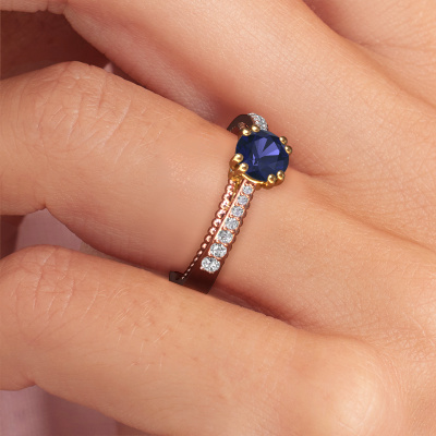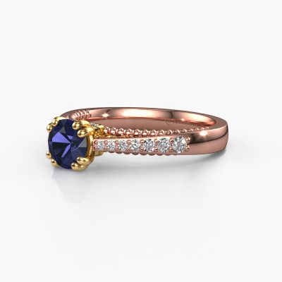 The ring shown above is called the Rozella. We call this type of ring a pavé solitaire ring because it has one centre gemstone and a band that is also pave set with gemstones. The 14 Carat rose gold engagement ring is set with a round 5.5 mm sapphire centre stone and the band is pave set with lab grown diamond gemstones. Each jewel is made to shine bright around your finger. Each jewel is hand made with love by our goldsmiths.This unique rose gold pavé solitaire engagement ring has an exquisite round sapphire centre stone. To further accentuate the centre stone, the band is fully set with more lab-grown diamonds. Its open prong setting allows light to strike the sapphire from various angles and this adds sparkle to your sapphire ring. The photo shown above depicts the goldsmith's carefully handcrafted details of the ring. The high positioning of the centre stone is truly eye-catching. The perfect engagement ring for the crown jewel of your life! After receiving your order, our goldsmiths will start the creative process of making your Rozella engagement ring. We don't keep stock. This is advantageous because these costs will not be passed on to you. Therefore, we can offer jewellery at exceptionally low prices.Our designers and goldsmiths work together each day, creating new jewels. Perhaps you have found a nice unique engagement ring somewhere, which can be used to customize your unique ring. Please feel free to contact us. We will make you an offer, based on a fair price/ quality ratio, which will amaze you.To make it easier for you, we offer a 30 day return policy. Check our terms and conditions.