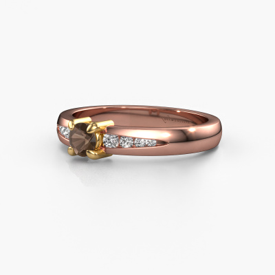 The ring shown above is called the Zohra. We call this type of ring a pavé solitaire ring because it has one centre gemstone and a band that is also pave set with gemstones. The 14 Carat rose gold engagement ring is set with a round 4 mm smokey quartz centre stone and the band is pave set with diamond gemstones. Each jewel is made just for you by our master goldsmiths in our own studio.This modern rose gold pavé solitaire engagement ring has an exquisite round smokey quartz centre stone. To further accentuate the centre stone, the band is fully set with more diamonds. Its open prong setting allows light to strike the smokey quartz from various angles and this adds sparkle to your smokey quartz ring. The photo shown above depicts the goldsmith's carefully handcrafted details of the ring. The high positioning of the centre stone is truly eye-catching. The perfect engagement ring for the crown jewel of your life! Because we design and deliver our own rings, we can offer you a engagement ring at a price you won't find anywhere else. A ring is made to order, which helps prevent excess supplies, so we can make you a great price offer. We understand it feels risky, buying your engagement ring online, but we will gladly assist in the designing process, taking your budget into consideration.Our team adds new designs to our online collection daily. Our designers and goldsmiths work together in creating the best design. We strive to offer a diverse collection of jewels. Perhaps you have a specific jewel design in mind. One you came across somewhere. Please contact us for a free consultation. We will make you an offer, based on a fair price/ quality ratio, that will baffle you.To make it easier for you, we offer a 30 day return policy. Check our terms and conditions.