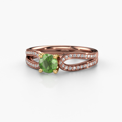 The ring shown above is called the Antonia rnd 2. We call this type of ring a pavé solitaire ring because it has one centre gemstone and a band that is also pave set with gemstones. The 14 Carat rose gold engagement ring is set with a round 5 mm tourmaline green centre stone and the band is pave set with diamond gemstones. Each jewel is made just for you, with attention to detail and design.This traditional rose gold pavé solitaire engagement ring has an exquisite round tourmaline green centre stone. To further accentuate the centre stone, the band is fully set with more diamonds. Its open prong setting allows light to strike the tourmaline green from various angles and this adds sparkle to your tourmaline green ring. The photo shown above depicts the goldsmith's carefully handcrafted details of the ring. The high positioning of the centre stone is truly eye-catching. The perfect engagement ring for the crown jewel of your life! After receiving your order, our goldsmiths will start the creative process of making your Antonia rnd 2 engagement ring. We don't keep stock. This is advantageous because these costs will not be passed on to you. Therefore, we can offer jewellery at exceptionally low prices.Have you found a specific engagement ring somewhere which you would like to give to your loved one? Please feel free to express your wishes to our jewel designers because we would be honoured to turn your design into a traditional engagement ring. You can follow the development of your ring design because we use 3D drawings. This gives you a realistic preview of how your design will look. You can also preorder a dummy. A dummy is a plastic ring, which can be shaped according your ring design. You can try it on and check if its width and size are suitable for you. We will gladly send you a non-binding offer, based on a fair price/ quality ratio. It will amaze you, considering the quality of the ring and gemstones.To make it easier for you, we offer a 30 day return policy. Check our terms and conditions.