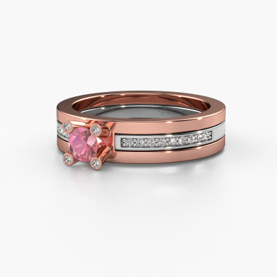 The ring shown above is called the Alisha. We call this type of ring a pavé solitaire ring because it has one centre gemstone and a band that is also pave set with gemstones. The 14 Carat rose gold engagement ring is set with a round 4 mm tourmaline pink centre stone and the band is pave set with diamond gemstones. Each jewel is unique in every way! Simply customize to your liking,This design rose gold pavé solitaire engagement ring has an exquisite round tourmaline pink centre stone. To further accentuate the centre stone, the band is fully set with more diamonds. Its open prong setting allows light to strike the tourmaline pink from various angles and this adds sparkle to your tourmaline pink ring. The photo shown above depicts the goldsmith's carefully handcrafted details of the ring. The high positioning of the centre stone is truly eye-catching. The perfect engagement ring for the crown jewel of your life! By using a combination of the latest modern techniques, combined with ancient crafting, we can make all our engagement rings in our own studio. Each jewel is made to order. This is advantageous because we can offer you a price you won't find anywhere else.Have you found a specific engagement ring somewhere which you would like to give to your loved one? Please feel free to express your wishes to our jewel designers because we would be honoured to turn your design into a design engagement ring. You can follow the development of your ring design because we use 3D drawings. This gives you a realistic preview of how your design will look. You can also preorder a dummy. A dummy is a plastic ring, which can be shaped according your ring design. You can try it on and check if its width and size are suitable for you. We will gladly send you a non-binding offer, based on a fair price/ quality ratio. It will amaze you, considering the quality of the ring and gemstones.To make it easier for you, we offer a 30 day return policy. Check our terms and conditions.
