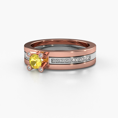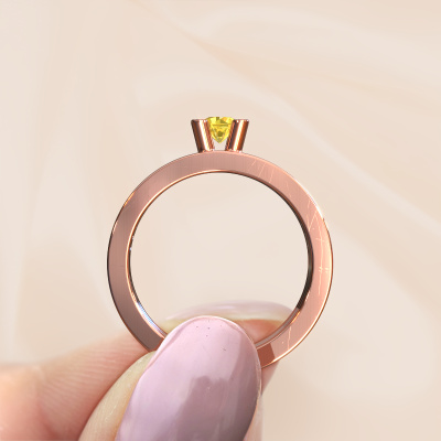 The ring shown above is called the Alisha. We call this type of ring a pavé solitaire ring because it has one centre gemstone and a band that is also pave set with gemstones. The 14 Carat rose gold engagement ring is set with a round 4 mm yellow sapphire centre stone and the band is pave set with diamond gemstones. Each jewel is unique in every way! Simply customize to your liking,This design rose gold pavé solitaire engagement ring has an exquisite round yellow sapphire centre stone. To further accentuate the centre stone, the band is fully set with more diamonds. Its open prong setting allows light to strike the yellow sapphire from various angles and this adds sparkle to your yellow sapphire ring. The photo shown above depicts the goldsmith's carefully handcrafted details of the ring. The high positioning of the centre stone is truly eye-catching. The perfect engagement ring for the crown jewel of your life! By using a combination of the latest modern techniques, combined with ancient crafting, we can make all our engagement rings in our own studio. Each jewel is made to order. This is advantageous because we can offer you a price you won't find anywhere else.Have you found a specific engagement ring somewhere which you would like to give to your loved one? Please feel free to express your wishes to our jewel designers because we would be honoured to turn your design into a design engagement ring. You can follow the development of your ring design because we use 3D drawings. This gives you a realistic preview of how your design will look. You can also preorder a dummy. A dummy is a plastic ring, which can be shaped according your ring design. You can try it on and check if its width and size are suitable for you. We will gladly send you a non-binding offer, based on a fair price/ quality ratio. It will amaze you, considering the quality of the ring and gemstones.To make it easier for you, we offer a 30 day return policy. Check our terms and conditions.