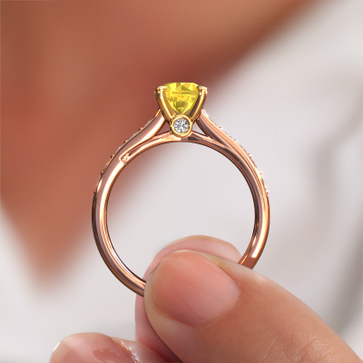The ring shown above is called the Valorie RND 2. We call this type of ring a pavé solitaire ring because it has one centre gemstone and a band that is also pave set with gemstones. The 14 Carat rose gold engagement ring is set with a round 6.5 mm yellow sapphire centre stone and the band is pave set with lab grown diamond gemstones. Each jewel is made just for you, with attention to detail and design.This modern rose gold pavé solitaire engagement ring has an exquisite round yellow sapphire centre stone. To further accentuate the centre stone, the band is fully set with more lab-grown diamonds. Its open prong setting allows light to strike the yellow sapphire from various angles and this adds sparkle to your yellow sapphire ring. The photo shown above depicts the goldsmith's carefully handcrafted details of the ring. The high positioning of the centre stone is truly eye-catching. The perfect engagement ring for the crown jewel of your life! By using our modern techniques, we can design and customize the finest quality jewels with the utmost care for you. Our engagement rings are always priced 30 percent lower than other jewellers. We make engagement rings to order so we don't have to maintain a large stock. If you have a certain budget, we are more than happy to advice you accordingly.Our designers and goldsmiths work together each day, creating new jewels. Perhaps you have found a nice modern engagement ring somewhere, which can be used to customize your unique ring. Please feel free to contact us. We will make you an offer, based on a fair price/ quality ratio, which will amaze you.To make it easier for you, we offer a 30 day return policy. Check our terms and conditions.