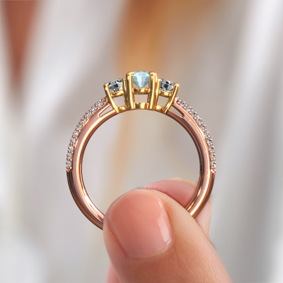 This 14 Carat rose gold ring is called Marielle OVL and is set with 6.5x4.5 mm aquamarine. Does your girlfriend fancy exclusive jewellery? Or would you like to show her that she deserves the finest jewellery? This rose gold ring is pure craftsmanship, love and passion combined with the latest techniques coming together in perfect harmony. It requires a keen eye, patience and a skilful hand to mould this ring into perfection. Just the job for our expert goldsmith! The aquamarine set gemstones gives this rose gold ring an extra glamorous appearance. Customize the style of the pavé engagement ring to her liking with a wide variety of precious metals and gemstones which you select. That is how you create a unique ring for the most exclusive woman in your life! This jewel is made just for you by our master goldsmiths in our own studio.Are you on a budget? Please feel free to contact us, so we can go discuss your options. We offer our engagement rings at guaranteed best price, because we make them to order. You won't find such a price anywhere else!Have you found a specific engagement ring somewhere which you would like to give to your loved one? Please feel free to express your wishes to our jewel designers because we would be honoured to turn your design into a exclusive engagement ring. You can follow the development of your ring design because we use 3D drawings. This gives you a realistic preview of how your design will look. You can also preorder a dummy. A dummy is a plastic ring, which can be shaped according your ring design. You can try it on and check if its width and size are suitable for you. We will gladly send you a non-binding offer, based on a fair price/ quality ratio. It will amaze you, considering the quality of the ring and gemstones.To make it easier for you, we offer a 30 day return policy. Check our terms and conditions.