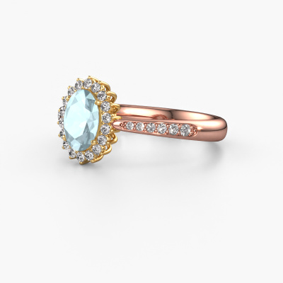 The ring shown above is called the Tilly ovl 2. We call this type of ring a cluster ring, the centre gemstone is surrounded by smaller sized stones. This 14 Carat rose gold version is set with a 7x5 mm oval aquamarine centre stone, embraced by smaller lab-grown diamonds. If you look at this rose gold cluster engagement ring, you might get the impression that its smaller sized stones collide with the bigger aquamarine, so it is shaped like a flower. Therefore this engagement ring is also known as the flower ring. Our artisan goldsmiths get the job done. Each individual stone is carefully set by hand. During manufacturing, light fall is constantly monitored to make sure the special cluster effect is still visible. In the end you get the perfect engagement ring with a radiant aquamarine gemstone centrepiece. You can imagine the effect of a ring of such significance when you give tot the love of your life on her special day to shine. By using our modern techniques, we can design and customize the finest quality jewels with the utmost care for you. Our engagement rings are always priced 30 percent lower than other jewellers. We make engagement rings to order so we don't have to maintain a large stock. If you have a certain budget, we are more than happy to advice you accordingly.Different styles of new rings are made daily by our team. Perhaps you have found a cluster engagement ring somewhere. One you would like to give to your loved one. Please feel free to share your thoughts and design with our jewel designers. We would love to turn your design into a classic engagement ring. You can follow the development of your ring design because we use very detailed 3D drawings. On top of that, you can order a dummy of the design. A dummy is a plastic ring, which can be shaped according your ring design. You can try it on and check if the engagement ring is up to standard. We will gladly send you a non-binding offer, based on a fair price/ quality ratio. The offer will baffle you, considering the quality of the ring and gemstones.To make it easier for you, we offer a 30 day return policy. Check our terms and conditions.