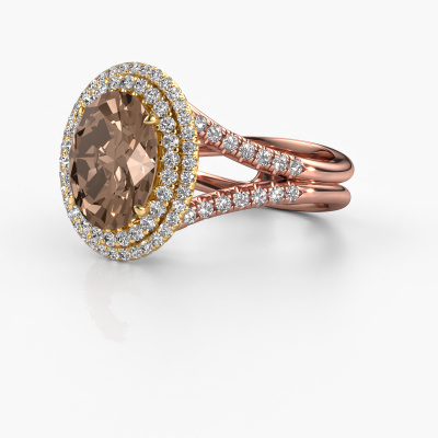 The ring shown above is called the Elvie. We call this type of ring a halo ring because it has one centre gemstone and a band that is also pave set with gemstones. The 14 Carat rose gold engagement ring is set with a oval 2.70 crt brown diamond centre stone and the band is pave set with lab-grown diamonds. What makes this vintage rose gold pavé solitaire ring special are the smaller sized stones embracing the centre stone. This gorgeous engagement ring is called a pavé solitaire ring because the smaller gemstones give the centre stone a pavé solitaire of surrounding light. In order for the smaller stones to enhance the centre stone, they have to be placed so there is no interference of light. And that's when our expert goldsmiths come in. Each individual stone is carefully set in the ring by hand. During manufacturing, light fall is constantly monitored to make sure the special pavé solitaire is still visible. In the end you get a unique engagement ring, with a brown diamond of your choosing at its centre. You can imagine the effect of a ring of such significance when you give it to her on her special day to shine. By using our modern techniques, we can design and customize the finest quality jewels with the utmost care for you. Our engagement rings are always priced 30 percent lower than other jewellers. We make engagement rings to order so we don't have to maintain a large stock. If you have a certain budget, we are more than happy to advice you accordingly.Do you have a specific ring in mind? One you came across somewhere. Please feel free to tell us your wishes and we will turn your design into a unique engagement ring. You can follow the development of your ring design because we use 3D drawings. This gives you a realistic preview of your design. We will gladly send you a non-binding offer, based on a fair price/ quality ratio. It will amaze you.To make it easier for you, we offer a 30 day return policy. Check our terms and conditions.