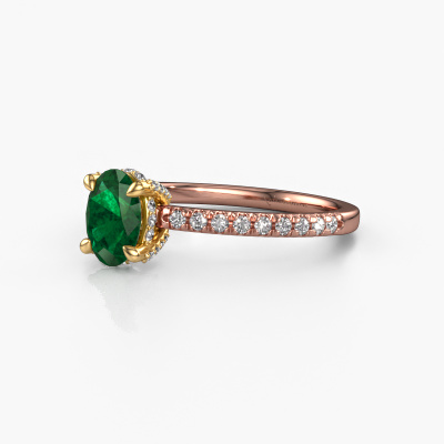 This 14 Carat rose gold ring is called Saskia 1 ovl and is set with 7x5 mm emerald. Does your girlfriend fancy exclusive jewellery? Or would you like to show her that she deserves the finest jewellery? This rose gold ring is pure craftsmanship, love and passion combined with the latest techniques coming together in perfect harmony. It requires a keen eye, patience and a skilful hand to mould this ring into perfection. Just the job for our expert goldsmith! The emerald set gemstones gives this rose gold ring an extra glamorous appearance. Customize the style of the daring engagement ring to her liking with a wide variety of precious metals and gemstones which you select. That is how you create a unique ring for the most exclusive woman in your life! This jewel is made by a team of passionate goldsmiths and jewel designers. This will make your crown jewel truly eye-catching.After receiving your order, our goldsmiths will passionately start the creative process of making your engagement ring in our own studio. Because we don't have a big stockpile, these costs will not be passed on to you. Our pricing is proof of that! We offer top quality jewels at lowest price, guaranteed.Different styles of new rings are made daily by our team. Perhaps you have found a pavé solitaire engagement ring somewhere. One you would like to give to your loved one. Please feel free to share your thoughts and design with our jewel designers. We would love to turn your design into a luxury engagement ring. You can follow the development of your ring design because we use very detailed 3D drawings. On top of that, you can order a dummy of the design. A dummy is a plastic ring, which can be shaped according your ring design. You can try it on and check if the engagement ring is up to standard. We will gladly send you a non-binding offer, based on a fair price/ quality ratio. The offer will baffle you, considering the quality of the ring and gemstones.To make it easier for you, we offer a 30 day return policy. Check our terms and conditions.