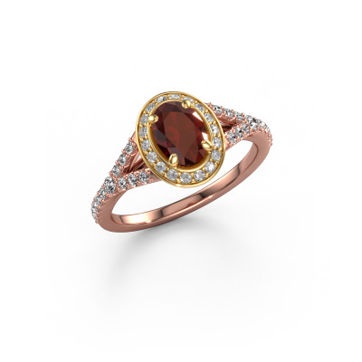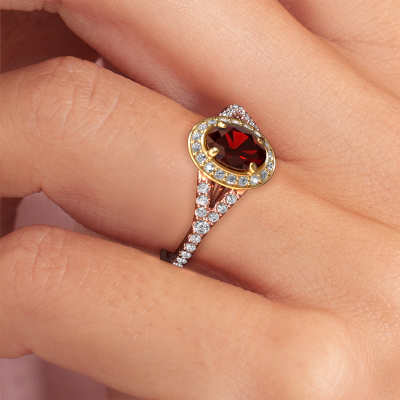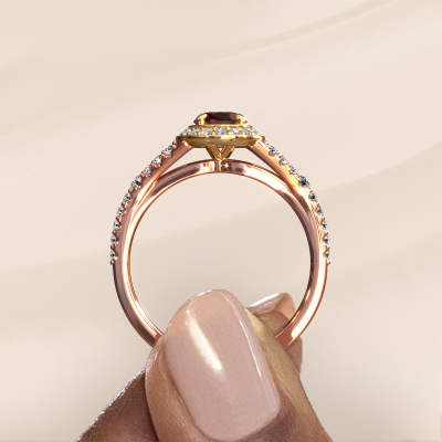 The ring shown above is called the Pamela OVL. We call this type of ring a halo ring because it has one centre gemstone and a band that is also pave set with gemstones. The 14 Carat rose gold engagement ring is set with a oval 7x5 mm garnet centre stone and the band is pave set with lab-grown diamonds. What makes this luxury rose gold halo ring special are the smaller sized stones embracing the centre stone. This gorgeous engagement ring is called a halo ring because the smaller gemstones give the centre stone a halo of surrounding light. In order for the smaller stones to enhance the centre stone, they have to be placed so there is no interference of light. And that's when our expert goldsmiths come in. Each individual stone is carefully set in the ring by hand. During manufacturing, light fall is constantly monitored to make sure the special halo is still visible. In the end you get a unique engagement ring, with a garnet of your choosing at its centre. You can imagine the effect of a ring of such significance when you give it to her on her special day to shine. By using our modern techniques, we can design and customize the finest quality jewels with the utmost care for you. Our engagement rings are always priced 30 percent lower than other jewellers. We make engagement rings to order so we don't have to maintain a large stock. If you have a certain budget, we are more than happy to advice you accordingly.Our team adds new designs to our online collection daily. Our designers and goldsmiths work together in creating the best design. We strive to offer a diverse collection of jewels. Perhaps you have a specific jewel design in mind. One you came across somewhere. Please contact us for a free consultation. We will make you an offer, based on a fair price/ quality ratio, that will baffle you.To make it easier for you, we offer a 30 day return policy. Check our terms and conditions.