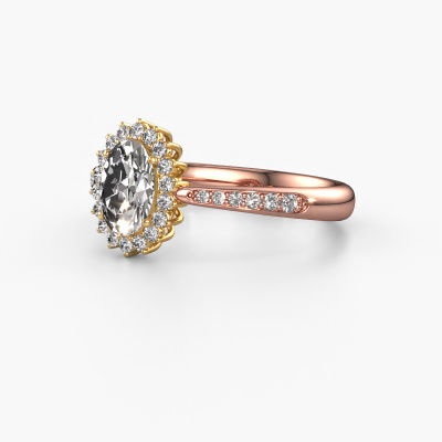 The ring shown above is called the Tilly ovl 2. We call this type of ring a cluster ring, the centre gemstone is surrounded by smaller sized stones. This 14 Carat rose gold version is set with a 0.70 crt oval lab grown diamond centre stone, embraced by smaller lab-grown diamonds. If you look at this rose gold cluster engagement ring, you might get the impression that its smaller sized stones collide with the bigger lab grown diamond, so it is shaped like a flower. Therefore this engagement ring is also known as the flower ring. Our artisan goldsmiths get the job done. Each individual stone is carefully set by hand. During manufacturing, light fall is constantly monitored to make sure the special cluster effect is still visible. In the end you get the perfect engagement ring with a radiant lab grown diamond gemstone centrepiece. You can imagine the effect of a ring of such significance when you give tot the love of your life on her special day to shine. By using our modern techniques, we can design and customize the finest quality jewels with the utmost care for you. Our engagement rings are always priced 30 percent lower than other jewellers. We make engagement rings to order so we don't have to maintain a large stock. If you have a certain budget, we are more than happy to advice you accordingly.Different styles of new rings are made daily by our team. Perhaps you have found a cluster engagement ring somewhere. One you would like to give to your loved one. Please feel free to share your thoughts and design with our jewel designers. We would love to turn your design into a classic engagement ring. You can follow the development of your ring design because we use very detailed 3D drawings. On top of that, you can order a dummy of the design. A dummy is a plastic ring, which can be shaped according your ring design. You can try it on and check if the engagement ring is up to standard. We will gladly send you a non-binding offer, based on a fair price/ quality ratio. The offer will baffle you, considering the quality of the ring and gemstones.To make it easier for you, we offer a 30 day return policy. Check our terms and conditions.