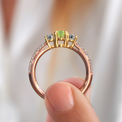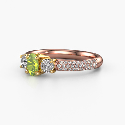 This 14 Carat rose gold ring is called Marielle OVL and is set with 6.5x4.5 mm peridot. Does your girlfriend fancy exclusive jewellery? Or would you like to show her that she deserves the finest jewellery? This rose gold ring is pure craftsmanship, love and passion combined with the latest techniques coming together in perfect harmony. It requires a keen eye, patience and a skilful hand to mould this ring into perfection. Just the job for our expert goldsmith! The peridot set gemstones gives this rose gold ring an extra glamorous appearance. Customize the style of the pavé engagement ring to her liking with a wide variety of precious metals and gemstones which you select. That is how you create a unique ring for the most exclusive woman in your life! This jewel is made just for you by our master goldsmiths in our own studio.Are you on a budget? Please feel free to contact us, so we can go discuss your options. We offer our engagement rings at guaranteed best price, because we make them to order. You won't find such a price anywhere else!Have you found a specific engagement ring somewhere which you would like to give to your loved one? Please feel free to express your wishes to our jewel designers because we would be honoured to turn your design into a exclusive engagement ring. You can follow the development of your ring design because we use 3D drawings. This gives you a realistic preview of how your design will look. You can also preorder a dummy. A dummy is a plastic ring, which can be shaped according your ring design. You can try it on and check if its width and size are suitable for you. We will gladly send you a non-binding offer, based on a fair price/ quality ratio. It will amaze you, considering the quality of the ring and gemstones.To make it easier for you, we offer a 30 day return policy. Check our terms and conditions.