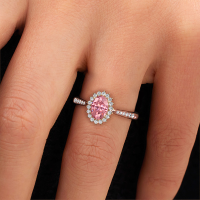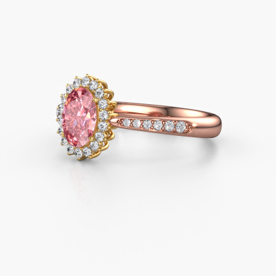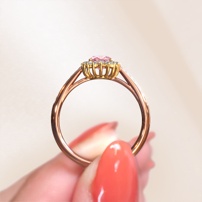 The ring shown above is called the Tilly ovl 2. We call this type of ring a cluster ring, the centre gemstone is surrounded by smaller sized stones. This 14 Carat rose gold version is set with a 7x5 mm oval pink lab grown diamond centre stone, embraced by smaller lab-grown diamonds. If you look at this rose gold cluster engagement ring, you might get the impression that its smaller sized stones collide with the bigger pink lab grown diamond, so it is shaped like a flower. Therefore this engagement ring is also known as the flower ring. Our artisan goldsmiths get the job done. Each individual stone is carefully set by hand. During manufacturing, light fall is constantly monitored to make sure the special cluster effect is still visible. In the end you get the perfect engagement ring with a radiant pink lab grown diamond gemstone centrepiece. You can imagine the effect of a ring of such significance when you give tot the love of your life on her special day to shine. By using our modern techniques, we can design and customize the finest quality jewels with the utmost care for you. Our engagement rings are always priced 30 percent lower than other jewellers. We make engagement rings to order so we don't have to maintain a large stock. If you have a certain budget, we are more than happy to advice you accordingly.Different styles of new rings are made daily by our team. Perhaps you have found a cluster engagement ring somewhere. One you would like to give to your loved one. Please feel free to share your thoughts and design with our jewel designers. We would love to turn your design into a classic engagement ring. You can follow the development of your ring design because we use very detailed 3D drawings. On top of that, you can order a dummy of the design. A dummy is a plastic ring, which can be shaped according your ring design. You can try it on and check if the engagement ring is up to standard. We will gladly send you a non-binding offer, based on a fair price/ quality ratio. The offer will baffle you, considering the quality of the ring and gemstones.To make it easier for you, we offer a 30 day return policy. Check our terms and conditions.