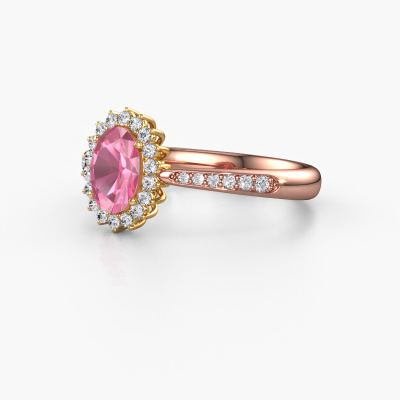 The ring shown above is called the Tilly ovl 2. We call this type of ring a cluster ring, the centre gemstone is surrounded by smaller sized stones. This 14 Carat rose gold version is set with a 7x5 mm oval pink sapphire centre stone, embraced by smaller lab-grown diamonds. If you look at this rose gold cluster engagement ring, you might get the impression that its smaller sized stones collide with the bigger pink sapphire, so it is shaped like a flower. Therefore this engagement ring is also known as the flower ring. Our artisan goldsmiths get the job done. Each individual stone is carefully set by hand. During manufacturing, light fall is constantly monitored to make sure the special cluster effect is still visible. In the end you get the perfect engagement ring with a radiant pink sapphire gemstone centrepiece. You can imagine the effect of a ring of such significance when you give tot the love of your life on her special day to shine. By using our modern techniques, we can design and customize the finest quality jewels with the utmost care for you. Our engagement rings are always priced 30 percent lower than other jewellers. We make engagement rings to order so we don't have to maintain a large stock. If you have a certain budget, we are more than happy to advice you accordingly.Different styles of new rings are made daily by our team. Perhaps you have found a cluster engagement ring somewhere. One you would like to give to your loved one. Please feel free to share your thoughts and design with our jewel designers. We would love to turn your design into a classic engagement ring. You can follow the development of your ring design because we use very detailed 3D drawings. On top of that, you can order a dummy of the design. A dummy is a plastic ring, which can be shaped according your ring design. You can try it on and check if the engagement ring is up to standard. We will gladly send you a non-binding offer, based on a fair price/ quality ratio. The offer will baffle you, considering the quality of the ring and gemstones.To make it easier for you, we offer a 30 day return policy. Check our terms and conditions.
