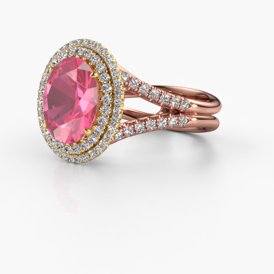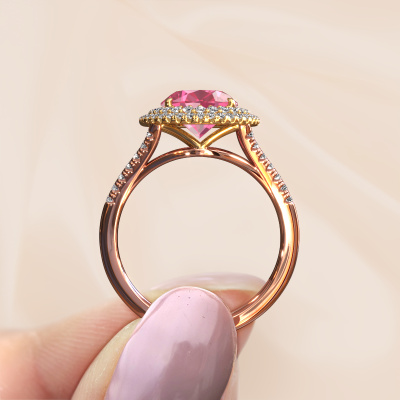 The ring shown above is called the Elvie. We call this type of ring a halo ring because it has one centre gemstone and a band that is also pave set with gemstones. The 14 Carat rose gold engagement ring is set with a oval 10x8 mm pink sapphire centre stone and the band is pave set with lab-grown diamonds. What makes this vintage rose gold pavé solitaire ring special are the smaller sized stones embracing the centre stone. This gorgeous engagement ring is called a pavé solitaire ring because the smaller gemstones give the centre stone a pavé solitaire of surrounding light. In order for the smaller stones to enhance the centre stone, they have to be placed so there is no interference of light. And that's when our expert goldsmiths come in. Each individual stone is carefully set in the ring by hand. During manufacturing, light fall is constantly monitored to make sure the special pavé solitaire is still visible. In the end you get a unique engagement ring, with a pink sapphire of your choosing at its centre. You can imagine the effect of a ring of such significance when you give it to her on her special day to shine. By using our modern techniques, we can design and customize the finest quality jewels with the utmost care for you. Our engagement rings are always priced 30 percent lower than other jewellers. We make engagement rings to order so we don't have to maintain a large stock. If you have a certain budget, we are more than happy to advice you accordingly.Do you have a specific ring in mind? One you came across somewhere. Please feel free to tell us your wishes and we will turn your design into a unique engagement ring. You can follow the development of your ring design because we use 3D drawings. This gives you a realistic preview of your design. We will gladly send you a non-binding offer, based on a fair price/ quality ratio. It will amaze you.To make it easier for you, we offer a 30 day return policy. Check our terms and conditions.