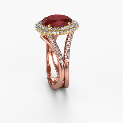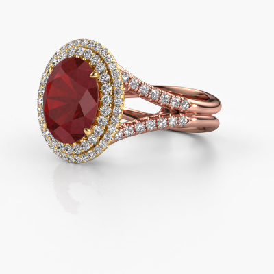 The ring shown above is called the Elvie. We call this type of ring a halo ring because it has one centre gemstone and a band that is also pave set with gemstones. The 14 Carat rose gold engagement ring is set with a oval 10x8 mm ruby centre stone and the band is pave set with lab-grown diamonds. What makes this vintage rose gold pavé solitaire ring special are the smaller sized stones embracing the centre stone. This gorgeous engagement ring is called a pavé solitaire ring because the smaller gemstones give the centre stone a pavé solitaire of surrounding light. In order for the smaller stones to enhance the centre stone, they have to be placed so there is no interference of light. And that's when our expert goldsmiths come in. Each individual stone is carefully set in the ring by hand. During manufacturing, light fall is constantly monitored to make sure the special pavé solitaire is still visible. In the end you get a unique engagement ring, with a ruby of your choosing at its centre. You can imagine the effect of a ring of such significance when you give it to her on her special day to shine. By using our modern techniques, we can design and customize the finest quality jewels with the utmost care for you. Our engagement rings are always priced 30 percent lower than other jewellers. We make engagement rings to order so we don't have to maintain a large stock. If you have a certain budget, we are more than happy to advice you accordingly.Do you have a specific ring in mind? One you came across somewhere. Please feel free to tell us your wishes and we will turn your design into a unique engagement ring. You can follow the development of your ring design because we use 3D drawings. This gives you a realistic preview of your design. We will gladly send you a non-binding offer, based on a fair price/ quality ratio. It will amaze you.To make it easier for you, we offer a 30 day return policy. Check our terms and conditions.