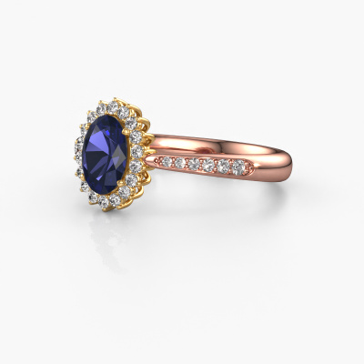 The ring shown above is called the Tilly ovl 2. We call this type of ring a cluster ring, the centre gemstone is surrounded by smaller sized stones. This 14 Carat rose gold version is set with a 7x5 mm oval sapphire centre stone, embraced by smaller lab-grown diamonds. If you look at this rose gold cluster engagement ring, you might get the impression that its smaller sized stones collide with the bigger sapphire, so it is shaped like a flower. Therefore this engagement ring is also known as the flower ring. Our artisan goldsmiths get the job done. Each individual stone is carefully set by hand. During manufacturing, light fall is constantly monitored to make sure the special cluster effect is still visible. In the end you get the perfect engagement ring with a radiant sapphire gemstone centrepiece. You can imagine the effect of a ring of such significance when you give tot the love of your life on her special day to shine. By using our modern techniques, we can design and customize the finest quality jewels with the utmost care for you. Our engagement rings are always priced 30 percent lower than other jewellers. We make engagement rings to order so we don't have to maintain a large stock. If you have a certain budget, we are more than happy to advice you accordingly.Different styles of new rings are made daily by our team. Perhaps you have found a cluster engagement ring somewhere. One you would like to give to your loved one. Please feel free to share your thoughts and design with our jewel designers. We would love to turn your design into a classic engagement ring. You can follow the development of your ring design because we use very detailed 3D drawings. On top of that, you can order a dummy of the design. A dummy is a plastic ring, which can be shaped according your ring design. You can try it on and check if the engagement ring is up to standard. We will gladly send you a non-binding offer, based on a fair price/ quality ratio. The offer will baffle you, considering the quality of the ring and gemstones.To make it easier for you, we offer a 30 day return policy. Check our terms and conditions.