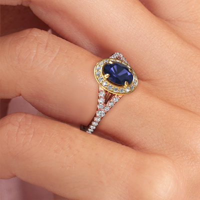 The ring shown above is called the Pamela OVL. We call this type of ring a halo ring because it has one centre gemstone and a band that is also pave set with gemstones. The 14 Carat rose gold engagement ring is set with a oval 7x5 mm sapphire centre stone and the band is pave set with lab-grown diamonds. What makes this luxury rose gold halo ring special are the smaller sized stones embracing the centre stone. This gorgeous engagement ring is called a halo ring because the smaller gemstones give the centre stone a halo of surrounding light. In order for the smaller stones to enhance the centre stone, they have to be placed so there is no interference of light. And that's when our expert goldsmiths come in. Each individual stone is carefully set in the ring by hand. During manufacturing, light fall is constantly monitored to make sure the special halo is still visible. In the end you get a unique engagement ring, with a sapphire of your choosing at its centre. You can imagine the effect of a ring of such significance when you give it to her on her special day to shine. By using our modern techniques, we can design and customize the finest quality jewels with the utmost care for you. Our engagement rings are always priced 30 percent lower than other jewellers. We make engagement rings to order so we don't have to maintain a large stock. If you have a certain budget, we are more than happy to advice you accordingly.Our team adds new designs to our online collection daily. Our designers and goldsmiths work together in creating the best design. We strive to offer a diverse collection of jewels. Perhaps you have a specific jewel design in mind. One you came across somewhere. Please contact us for a free consultation. We will make you an offer, based on a fair price/ quality ratio, that will baffle you.To make it easier for you, we offer a 30 day return policy. Check our terms and conditions.