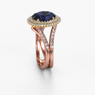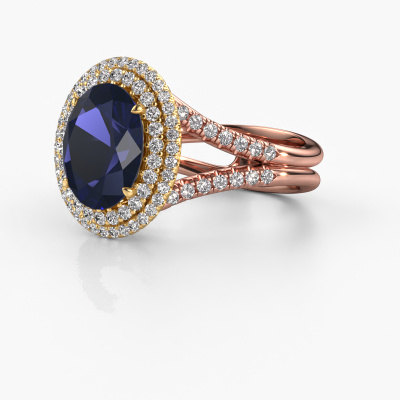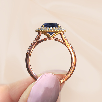 The ring shown above is called the Elvie. We call this type of ring a halo ring because it has one centre gemstone and a band that is also pave set with gemstones. The 14 Carat rose gold engagement ring is set with a oval 10x8 mm sapphire centre stone and the band is pave set with lab-grown diamonds. What makes this vintage rose gold pavé solitaire ring special are the smaller sized stones embracing the centre stone. This gorgeous engagement ring is called a pavé solitaire ring because the smaller gemstones give the centre stone a pavé solitaire of surrounding light. In order for the smaller stones to enhance the centre stone, they have to be placed so there is no interference of light. And that's when our expert goldsmiths come in. Each individual stone is carefully set in the ring by hand. During manufacturing, light fall is constantly monitored to make sure the special pavé solitaire is still visible. In the end you get a unique engagement ring, with a sapphire of your choosing at its centre. You can imagine the effect of a ring of such significance when you give it to her on her special day to shine. By using our modern techniques, we can design and customize the finest quality jewels with the utmost care for you. Our engagement rings are always priced 30 percent lower than other jewellers. We make engagement rings to order so we don't have to maintain a large stock. If you have a certain budget, we are more than happy to advice you accordingly.Do you have a specific ring in mind? One you came across somewhere. Please feel free to tell us your wishes and we will turn your design into a unique engagement ring. You can follow the development of your ring design because we use 3D drawings. This gives you a realistic preview of your design. We will gladly send you a non-binding offer, based on a fair price/ quality ratio. It will amaze you.To make it easier for you, we offer a 30 day return policy. Check our terms and conditions.