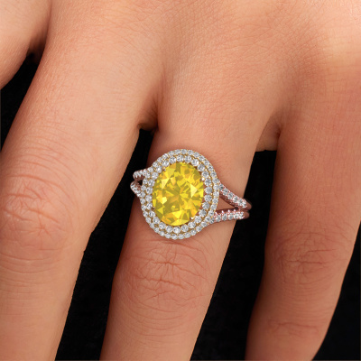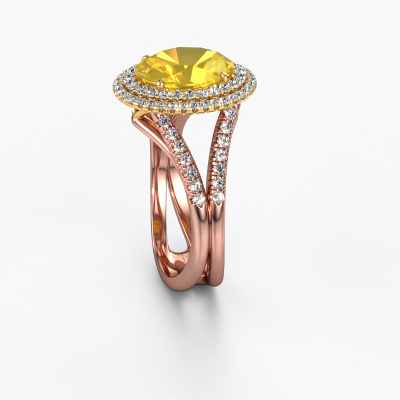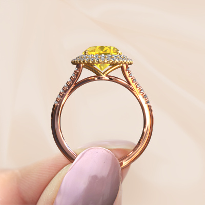The ring shown above is called the Elvie. We call this type of ring a halo ring because it has one centre gemstone and a band that is also pave set with gemstones. The 14 Carat rose gold engagement ring is set with a oval 10x8 mm yellow sapphire centre stone and the band is pave set with lab-grown diamonds. What makes this vintage rose gold pavé solitaire ring special are the smaller sized stones embracing the centre stone. This gorgeous engagement ring is called a pavé solitaire ring because the smaller gemstones give the centre stone a pavé solitaire of surrounding light. In order for the smaller stones to enhance the centre stone, they have to be placed so there is no interference of light. And that's when our expert goldsmiths come in. Each individual stone is carefully set in the ring by hand. During manufacturing, light fall is constantly monitored to make sure the special pavé solitaire is still visible. In the end you get a unique engagement ring, with a yellow sapphire of your choosing at its centre. You can imagine the effect of a ring of such significance when you give it to her on her special day to shine. By using our modern techniques, we can design and customize the finest quality jewels with the utmost care for you. Our engagement rings are always priced 30 percent lower than other jewellers. We make engagement rings to order so we don't have to maintain a large stock. If you have a certain budget, we are more than happy to advice you accordingly.Do you have a specific ring in mind? One you came across somewhere. Please feel free to tell us your wishes and we will turn your design into a unique engagement ring. You can follow the development of your ring design because we use 3D drawings. This gives you a realistic preview of your design. We will gladly send you a non-binding offer, based on a fair price/ quality ratio. It will amaze you.To make it easier for you, we offer a 30 day return policy. Check our terms and conditions.