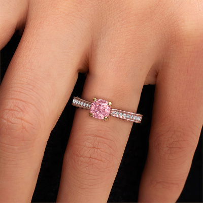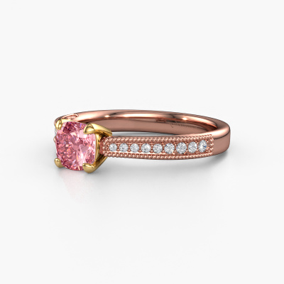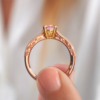 This 14 Carat rose gold ring is called Shonta CUS and is set with 5.5 mm pink lab grown diamond. This filigree rose gold engagement ring is a true work of art! A beautifully adorned design of intricate wires. With dedication, patience and the utmost precision, our expert goldsmith will design a ring just for you. The adornment of small wiring is crafted to perfection by hand. It's a lengthy process which includes welding, crafting and polishing until our Goldsmiths are completely satisfied with the result: a perfect eye-catching ring that makes her shine with delight. Therefore the vintage filigree engagement ring is an extraordinary gift to bestow upon the love of your life. A handmade one-of-a-kind personalized ring, to be given to that special someone on that special moment when you pop the question. Isn't that wonderful? This piece of jewellery is created to add sparkle to your finger, each jewel is lovingly made by hand by our goldsmiths.After receiving your order, our goldsmiths will start the creative process of making your Shonta CUS engagement ring. We don't keep stock. This is advantageous because these costs will not be passed on to you. Therefore, we can offer jewellery at exceptionally low prices.Our designers and goldsmiths work together each day, creating new jewels. Perhaps you have found a nice vintage engagement ring somewhere, which can be used to customize your unique ring. Please feel free to contact us. We will make you an offer, based on a fair price/ quality ratio, which will amaze you.To make it easier for you, we offer a 30 day return policy. Check our terms and conditions.