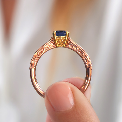 This 14 Carat rose gold ring is called Shonta CUS and is set with 5.5 mm sapphire. This filigree rose gold engagement ring is a true work of art! A beautifully adorned design of intricate wires. With dedication, patience and the utmost precision, our expert goldsmith will design a ring just for you. The adornment of small wiring is crafted to perfection by hand. It's a lengthy process which includes welding, crafting and polishing until our Goldsmiths are completely satisfied with the result: a perfect eye-catching ring that makes her shine with delight. Therefore the vintage filigree engagement ring is an extraordinary gift to bestow upon the love of your life. A handmade one-of-a-kind personalized ring, to be given to that special someone on that special moment when you pop the question. Isn't that wonderful? This piece of jewellery is created to add sparkle to your finger, each jewel is lovingly made by hand by our goldsmiths.After receiving your order, our goldsmiths will start the creative process of making your Shonta CUS engagement ring. We don't keep stock. This is advantageous because these costs will not be passed on to you. Therefore, we can offer jewellery at exceptionally low prices.Our designers and goldsmiths work together each day, creating new jewels. Perhaps you have found a nice vintage engagement ring somewhere, which can be used to customize your unique ring. Please feel free to contact us. We will make you an offer, based on a fair price/ quality ratio, which will amaze you.To make it easier for you, we offer a 30 day return policy. Check our terms and conditions.