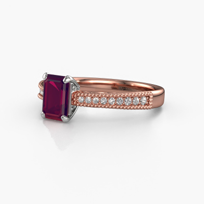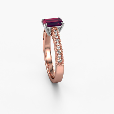 This 14 Carat rose gold ring is called Shonta EME and is set with rhodolite. An extraordinary rose gold vintage ring. One that will surely make the love of your life shine like a diamond! That is what we hope to achieve. This vintage engagement ring is set with exquisite rhodolite. Whichever gemstone you choose from our selection, is up to you. The gemstone is selected with great care because we believe your engagement ring must be adorned with nothing but the most beautiful gemstone. Wouldn't you agree? Our expert goldsmith will design your ring in our own artisan studio, where the rhodolite will be set with great precision. The ring will then be polished till it is absolutely perfect. Nothing but the best for the love of your life! This jewel is made by a team of passionate goldsmiths and jewel designers. This will make your crown jewel truly eye-catching.Are you on a budget? Please feel free to contact us, so we can go discuss your options. We offer our engagement rings at guaranteed best price, because we make them to order. You won't find such a price anywhere else!Have you found a specific engagement ring somewhere which you would like to give to your loved one? Please feel free to express your wishes to our jewel designers because we would be honoured to turn your design into a vintage engagement ring. You can follow the development of your ring design because we use 3D drawings. This gives you a realistic preview of how your design will look. You can also preorder a dummy. A dummy is a plastic ring, which can be shaped according your ring design. You can try it on and check if its width and size are suitable for you. We will gladly send you a non-binding offer, based on a fair price/ quality ratio. It will amaze you, considering the quality of the ring and gemstones.To make it easier for you, we offer a 30 day return policy. Check our terms and conditions.