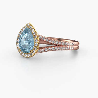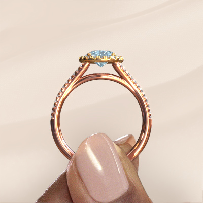 The ring shown above is called the Verla pear 2. We call this type of ring a halo ring because it has one centre gemstone and a band that is also pave set with gemstones. The 14 Carat rose gold engagement ring is set with a pear 8x6 mm blue lab grown diamond centre stone and the band is pave set with diamonds. What makes this exclusive rose gold halo ring special are the smaller sized stones embracing the centre stone. This gorgeous engagement ring is called a halo ring because the smaller gemstones give the centre stone a halo of surrounding light. In order for the smaller stones to enhance the centre stone, they have to be placed so there is no interference of light. And that's when our expert goldsmiths come in. Each individual stone is carefully set in the ring by hand. During manufacturing, light fall is constantly monitored to make sure the special halo is still visible. In the end you get a unique engagement ring, with a blue lab grown diamond of your choosing at its centre. You can imagine the effect of a ring of such significance when you give it to her on her special day to shine. After receiving your order, our goldsmiths will passionately start the creative process of making your engagement ring in our own studio. Because we don't have a big stockpile, these costs will not be passed on to you. Our pricing is proof of that! We offer top quality jewels at lowest price, guaranteed.Our designers and goldsmiths work together each day, creating new jewels. Perhaps you have found a nice exclusive engagement ring somewhere, which can be used to customize your unique ring. Please feel free to contact us. We will make you an offer, based on a fair price/ quality ratio, which will amaze you.To make it easier for you, we offer a 30 day return policy. Check our terms and conditions.
