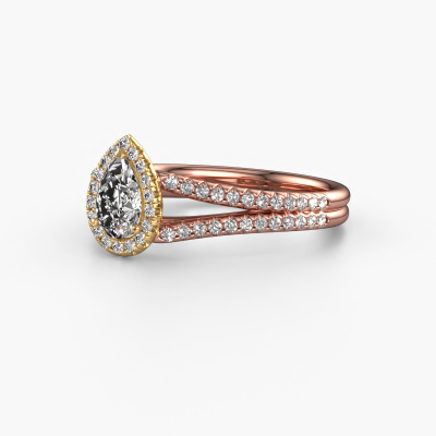 The ring shown above is called the Verla pear 2. We call this type of ring a halo ring because it has one centre gemstone and a band that is also pave set with gemstones. The 14 Carat rose gold engagement ring is set with a pear 0.45 crt diamond centre stone and the band is pave set with diamonds. What makes this exclusive rose gold halo ring special are the smaller sized stones embracing the centre stone. This gorgeous engagement ring is called a halo ring because the smaller gemstones give the centre stone a halo of surrounding light. In order for the smaller stones to enhance the centre stone, they have to be placed so there is no interference of light. And that's when our expert goldsmiths come in. Each individual stone is carefully set in the ring by hand. During manufacturing, light fall is constantly monitored to make sure the special halo is still visible. In the end you get a unique engagement ring, with a diamond of your choosing at its centre. You can imagine the effect of a ring of such significance when you give it to her on her special day to shine. After receiving your order, our goldsmiths will passionately start the creative process of making your engagement ring in our own studio. Because we don't have a big stockpile, these costs will not be passed on to you. Our pricing is proof of that! We offer top quality jewels at lowest price, guaranteed.Our designers and goldsmiths work together each day, creating new jewels. Perhaps you have found a nice exclusive engagement ring somewhere, which can be used to customize your unique ring. Please feel free to contact us. We will make you an offer, based on a fair price/ quality ratio, which will amaze you.To make it easier for you, we offer a 30 day return policy. Check our terms and conditions.