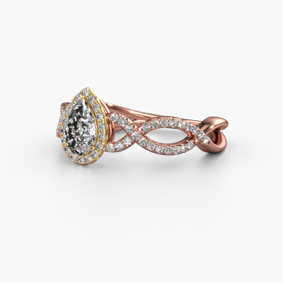 This 14 Carat rose gold ring is called Dionne pear and is set with 0.77 crt diamond. Does your girlfriend fancy exclusive jewellery? Or would you like to show her that she deserves the finest jewellery? This rose gold ring is pure craftsmanship, love and passion combined with the latest techniques coming together in perfect harmony. It requires a keen eye, patience and a skilful hand to mould this ring into perfection. Just the job for our expert goldsmith! The diamonds set gemstones gives this rose gold ring an extra glamorous appearance. Customize the style of the twist engagement ring to her liking with a wide variety of precious metals and gemstones which you select. That is how you create a unique ring for the most exclusive woman in your life! This jewel is created to add sparkle to your finger, each jewel is lovingly made by hand by our goldsmiths.Are you on a budget? Please feel free to contact us, so we can go discuss your options. We offer our engagement rings at guaranteed best price, because we make them to order. You won't find such a price anywhere else!Different styles of new rings are made daily by our team. Perhaps you have found a pavé solitaire engagement ring somewhere. One you would like to give to your loved one. Please feel free to share your thoughts and design with our jewel designers. We would love to turn your design into a exclusive engagement ring. You can follow the development of your ring design because we use very detailed 3D drawings. On top of that, you can order a dummy of the design. A dummy is a plastic ring, which can be shaped according your ring design. You can try it on and check if the engagement ring is up to standard. We will gladly send you a non-binding offer, based on a fair price/ quality ratio. The offer will baffle you, considering the quality of the ring and gemstones.To make it easier for you, we offer a 30 day return policy. Check our terms and conditions.