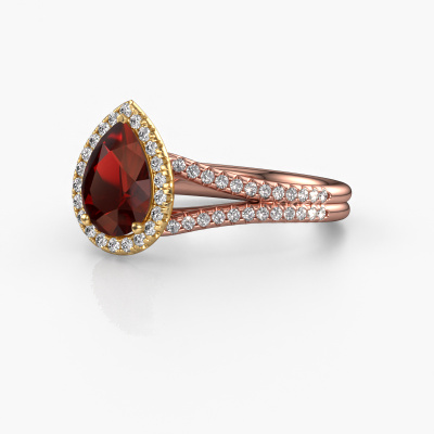 The ring shown above is called the Verla pear 2. We call this type of ring a halo ring because it has one centre gemstone and a band that is also pave set with gemstones. The 14 Carat rose gold engagement ring is set with a pear 8x6 mm garnet centre stone and the band is pave set with diamonds. What makes this exclusive rose gold halo ring special are the smaller sized stones embracing the centre stone. This gorgeous engagement ring is called a halo ring because the smaller gemstones give the centre stone a halo of surrounding light. In order for the smaller stones to enhance the centre stone, they have to be placed so there is no interference of light. And that's when our expert goldsmiths come in. Each individual stone is carefully set in the ring by hand. During manufacturing, light fall is constantly monitored to make sure the special halo is still visible. In the end you get a unique engagement ring, with a garnet of your choosing at its centre. You can imagine the effect of a ring of such significance when you give it to her on her special day to shine. After receiving your order, our goldsmiths will passionately start the creative process of making your engagement ring in our own studio. Because we don't have a big stockpile, these costs will not be passed on to you. Our pricing is proof of that! We offer top quality jewels at lowest price, guaranteed.Our designers and goldsmiths work together each day, creating new jewels. Perhaps you have found a nice exclusive engagement ring somewhere, which can be used to customize your unique ring. Please feel free to contact us. We will make you an offer, based on a fair price/ quality ratio, which will amaze you.To make it easier for you, we offer a 30 day return policy. Check our terms and conditions.